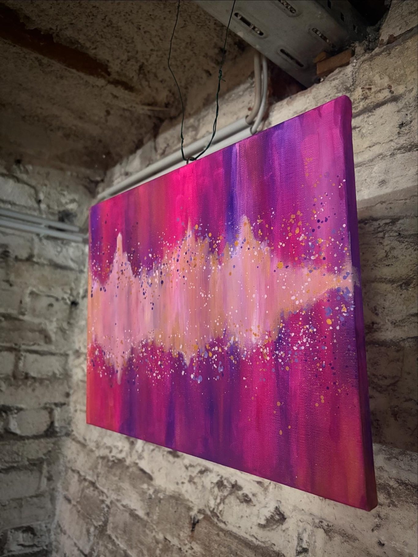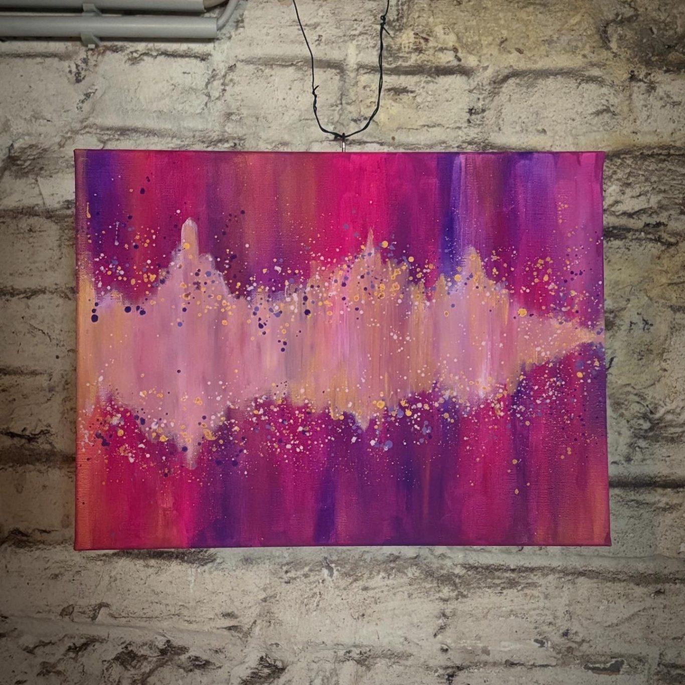 Eine Bewegung quer über die Leinwand, die zeigt, dass Energie auch in Farbe stattfinden kann. Ein Blickfang in Pink, Beere und Gold.