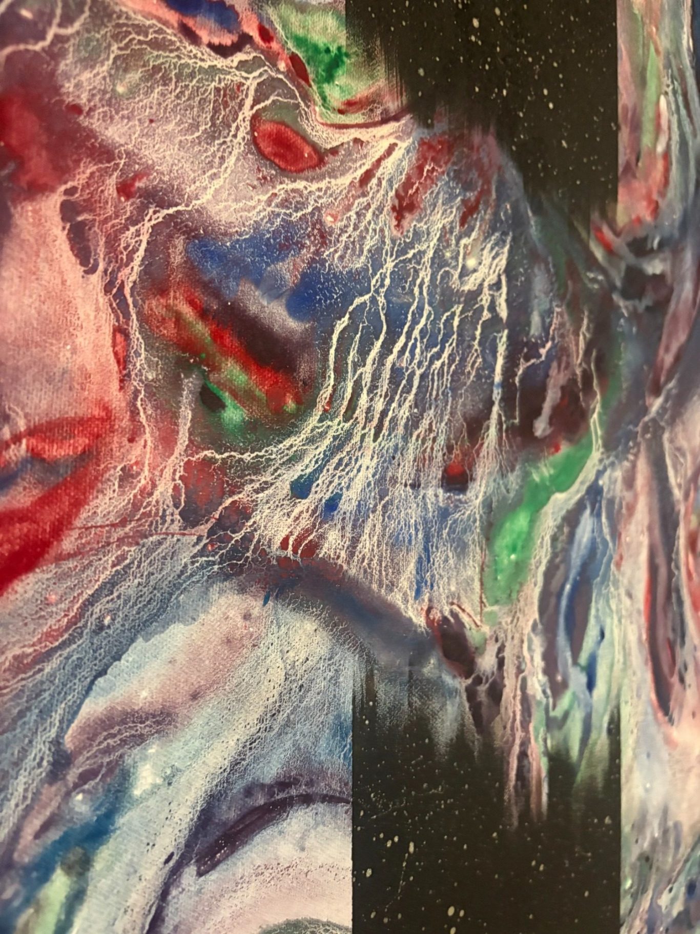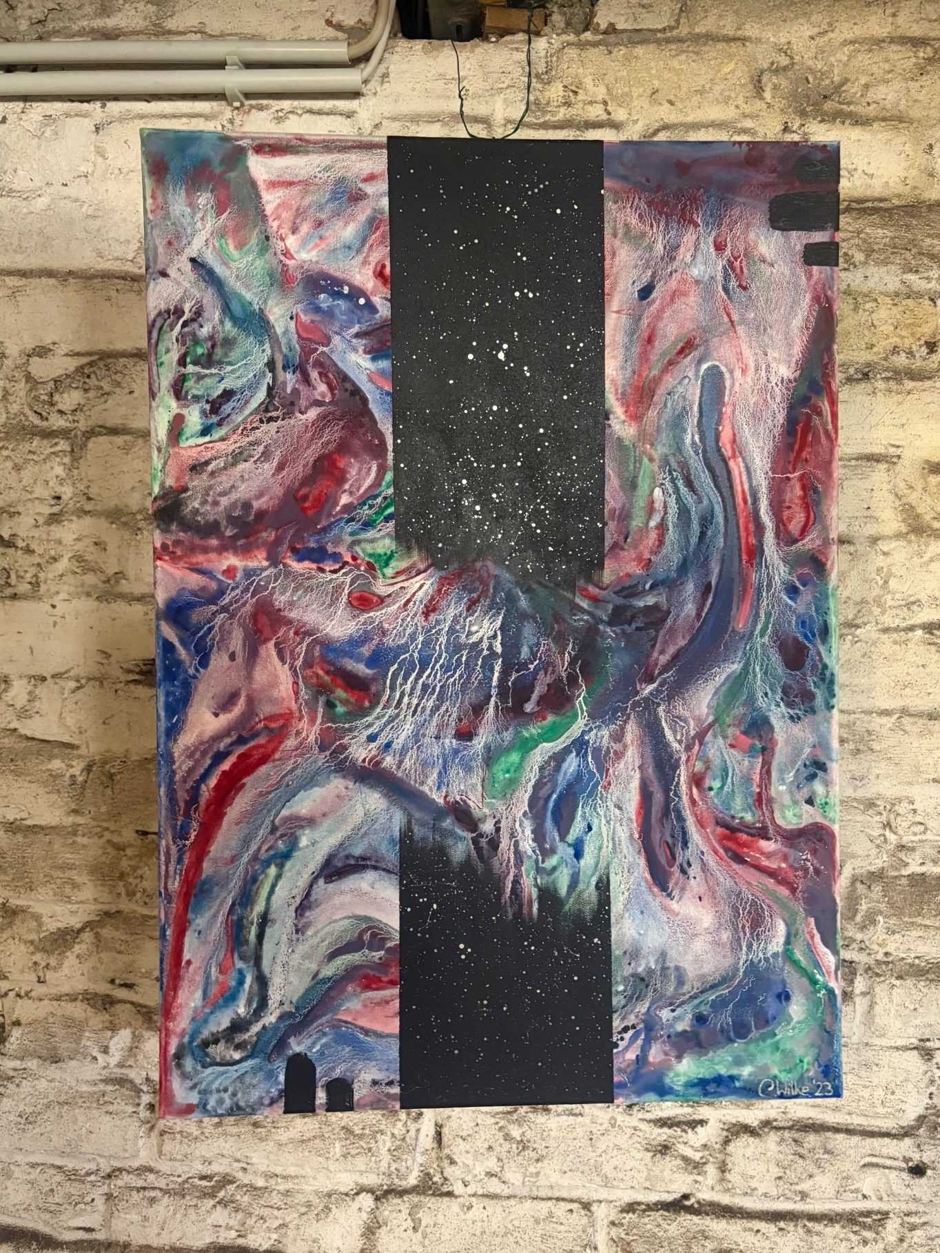 Ein Sturm auf der Leinwand.  Farben krachen aufeinander, Blitze aus Weiß zucken durch die Wirbel und mitten drin steht die Dunkelheit still. Laut und ungezähmt für wilde Wände.