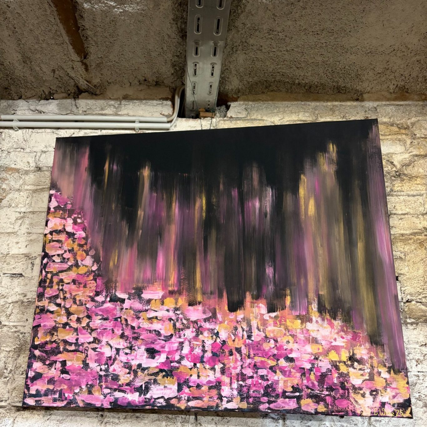 Die Pinselstriche laufen herab wie Regen an einer U-Bahn-Scheibe – ungefiltert, laut, lebendig.